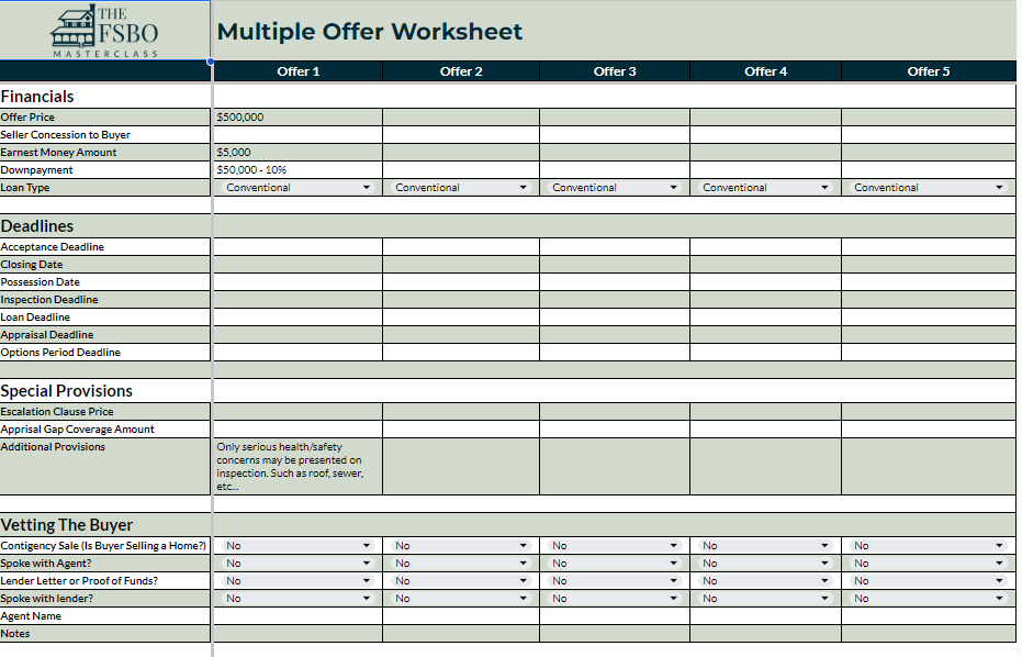 The FSBO Masterclass online course includes a spreadsheet specifically designed to evaluate offers.